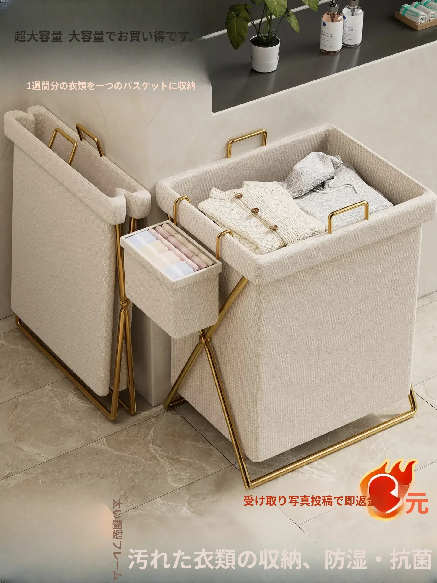 折りたたみ可能な大容量の洗濯カゴ!狭いスペースにもぴったりフィットする万能洗濯バスケット。バスルームやトイレでの洗濯物収納に最適!清潔感溢れるお部屋を実現します。