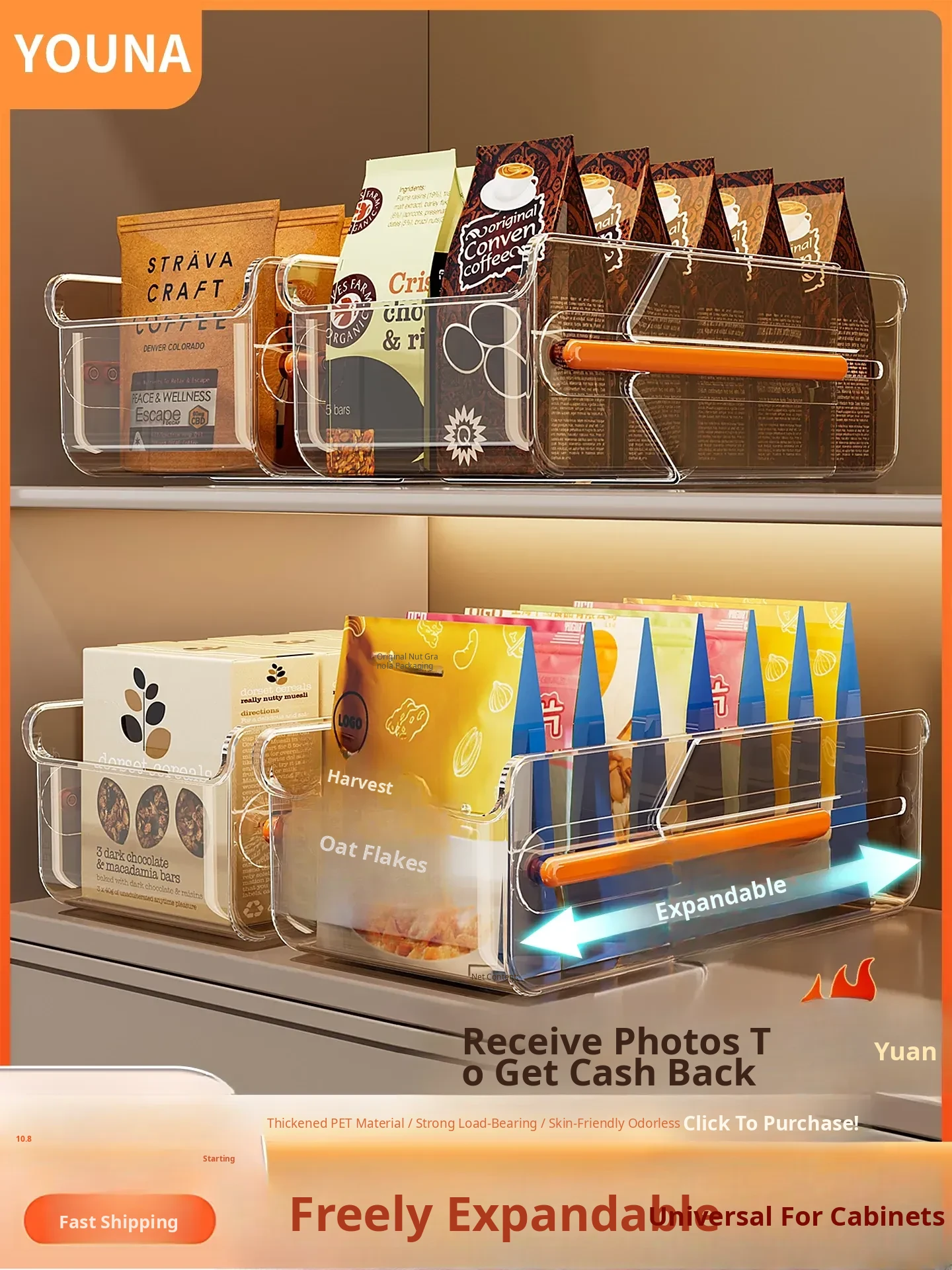 Expandable Transparent Plastic Kitchen Storage Bins - Perfect for Organizing Snacks and Miscellaneous Items on Your Countertop! Stylish and Functional Storage Solution for a Clutter-Free Kitchen.