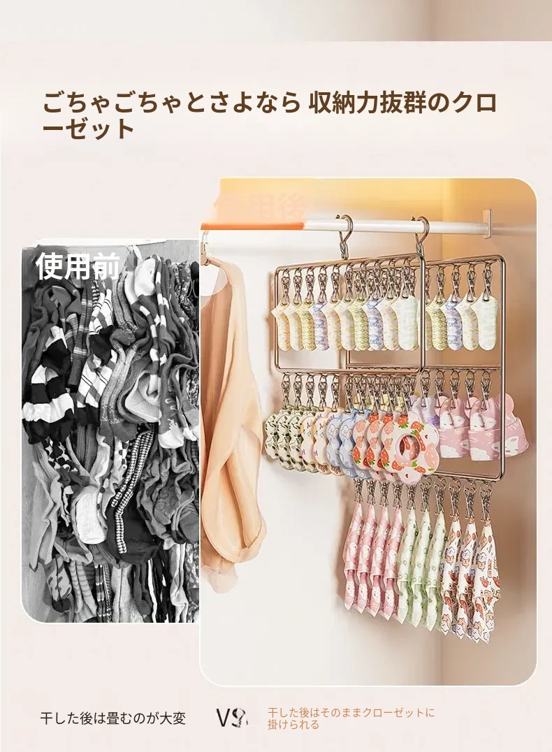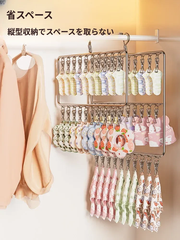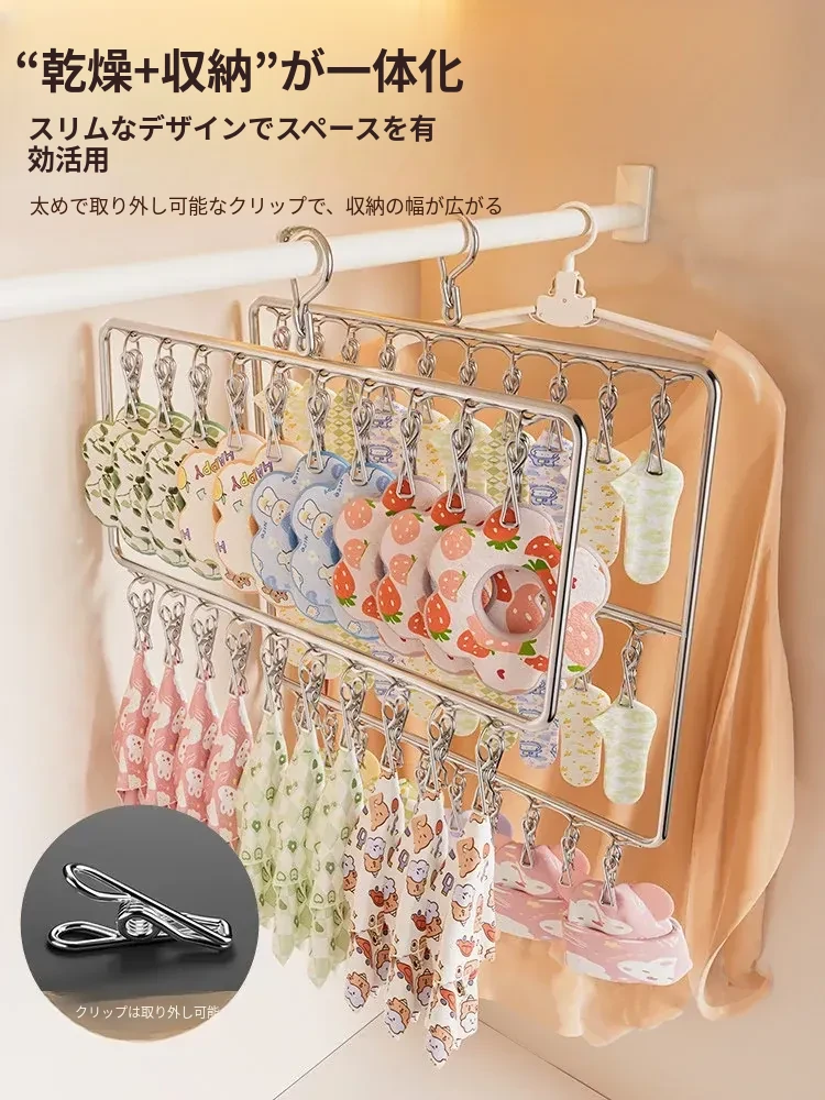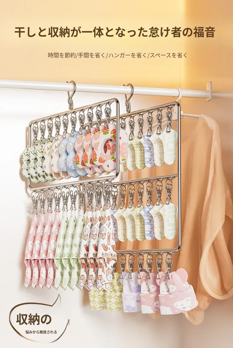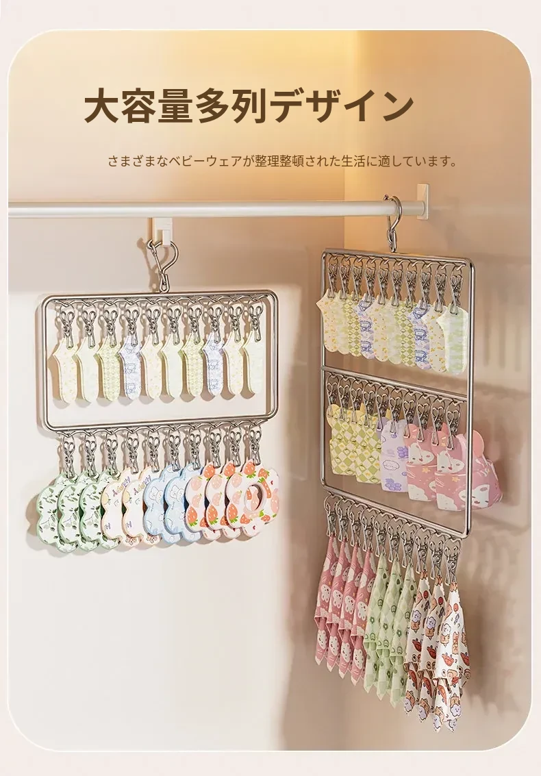 赤ちゃん用よだれかけ収納マジック!多機能クリップ付き、子供のクローゼットや下着、靴下の干し方もこれ一つで解決!おしゃれなハンガーとフックで、毎日の洗濯を楽しく。