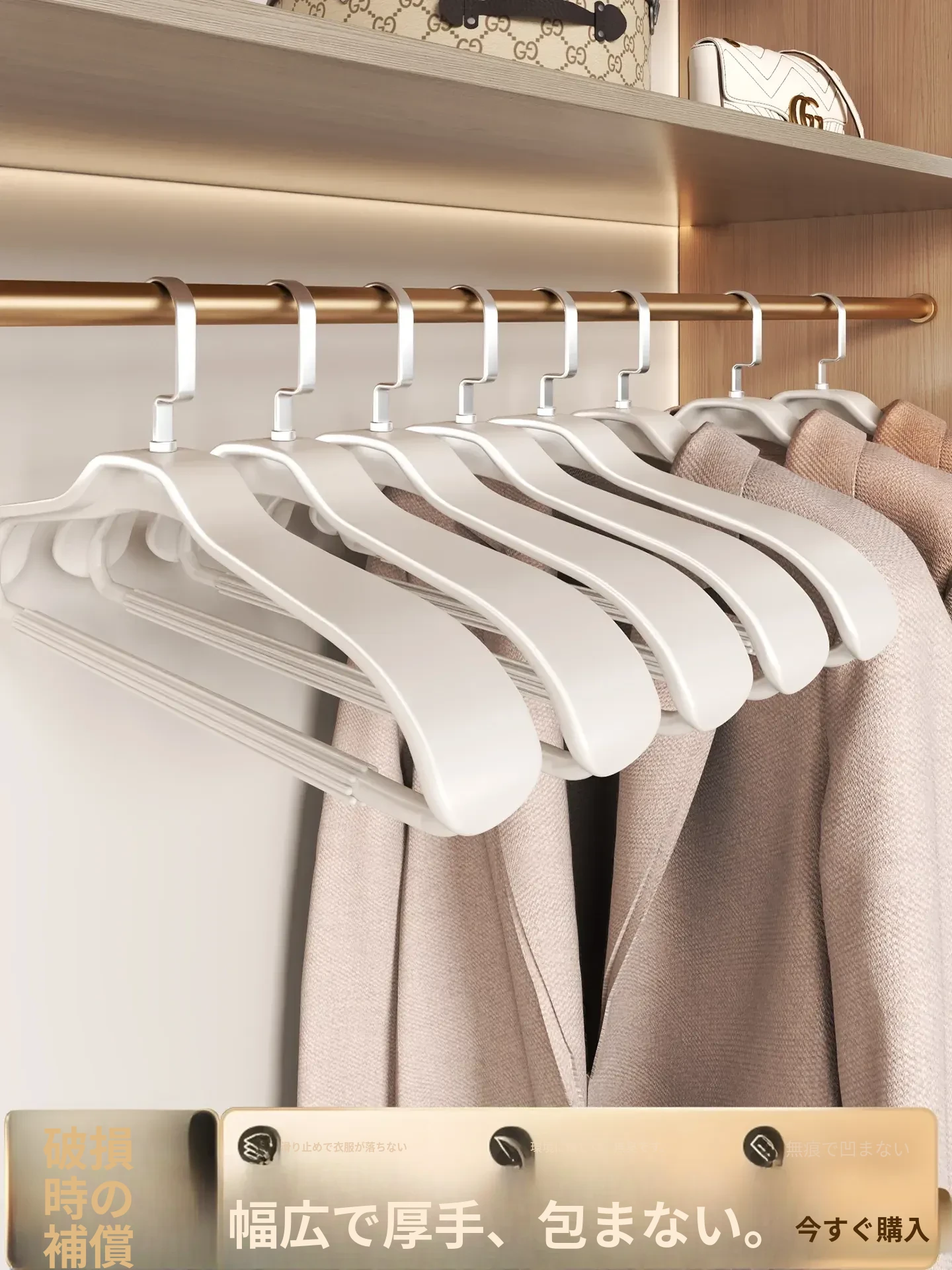 滑り止め付きハンガー - 家庭用無痕フックで衣類をしっかりサポート!厚手・太めのデザインで、ジャケットやコートもしっかり掛けられます。衣類を傷めず、すっきり収納できる優れたアイテムです!