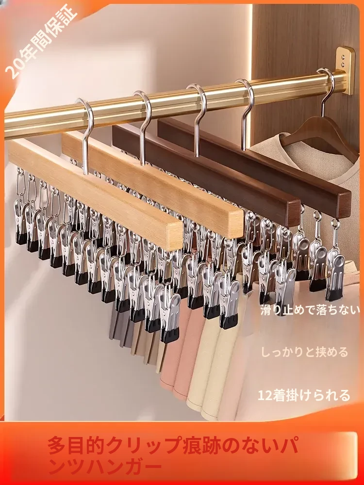 天然木製のパンツハンガー!子供用ステンレス無痕クリップ付き、スカートも安心!強力収納でクローゼットをスマートに整理整頓。おしゃれな収納アイテムで、毎日のコーディネートをより楽しく!