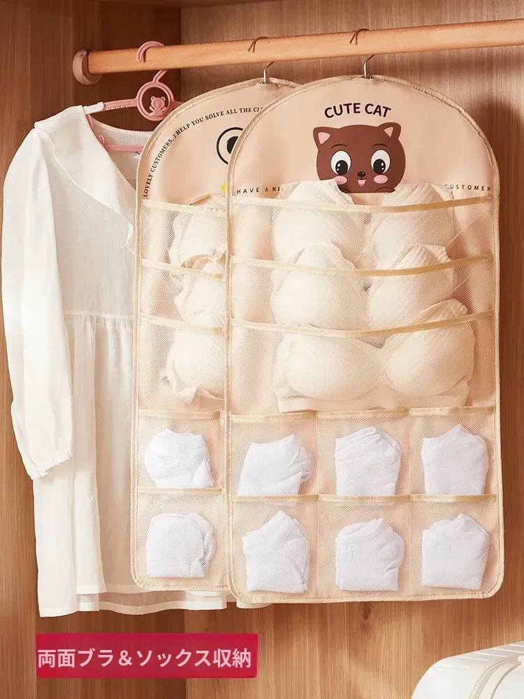 収納力抜群!衣類収納袋 - クローゼットにフック掛けできる両面ウォールハンガー。下着、パンツ、ブラを一括整理できる3in1収納マジック!お部屋をスッキリ整えて、毎日のコーディネートをもっと楽に!